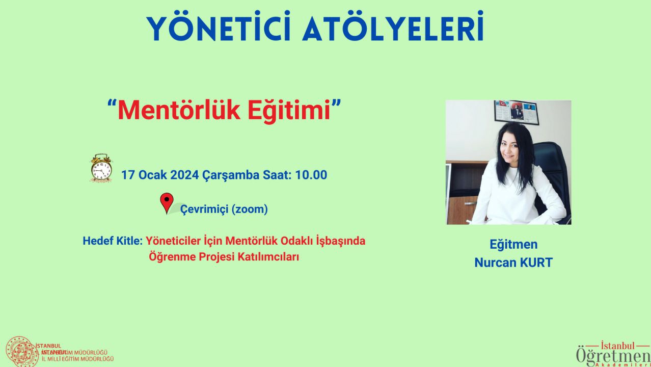 Atölyemiz, Yöneticiler İçin Mentörlük Odaklı İşbaşında Öğrenme Projesi kapsamında düzenlenmekte olup öncelikle proje katılımcısı yöneticilerimizin başvuruları kabul edilecektir. Kontenjan kalması halinde diğer katılımcılar dahil edilebilir.