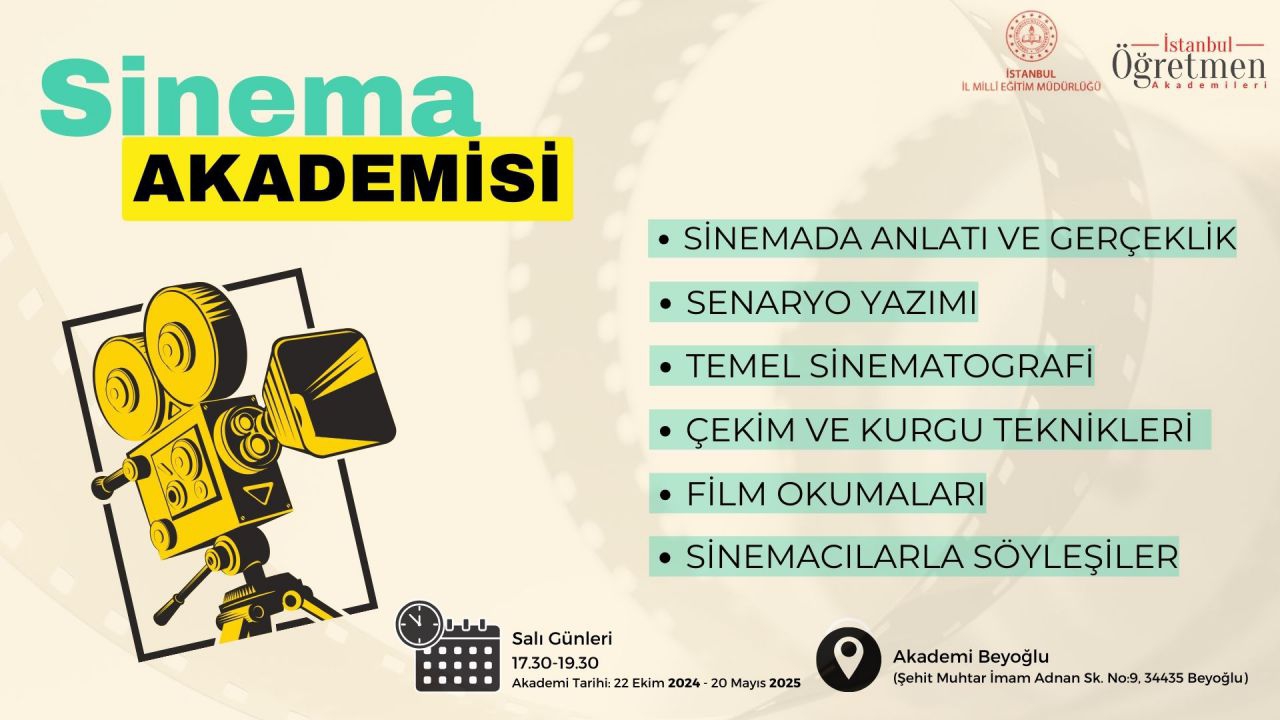 Görsel dilin inceliklerini kavramak, görsel okuryazarlık becerileri kazanmak, sinema literatürüne ve film diline aşinalık sağlamak, böylece birer eğitim profesyoneli olan öğretmenlerimizin kişisel ve mesleki becerilerine sinemanın imkanlarını kullanarak katkı sunmak amacıyla düzenlenen sinema akademimiz; 2024- 2025 döneminde de faaliyetlerine devam ediyor.