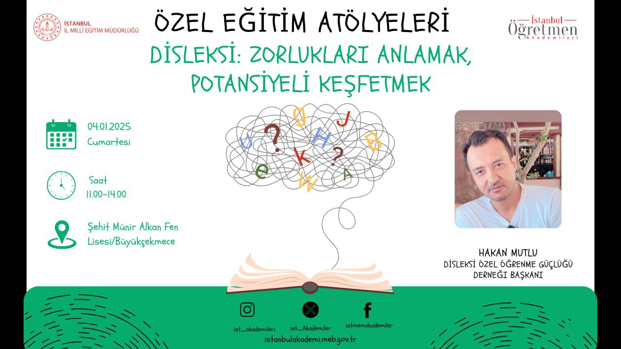 Bu eğitim öğretmenlere disleksi konusunda derinlemesine bilgi ve uygulama odaklı çözümler sunmayı amaçlıyor. Disleksinin belirtileri, öğretim stratejileri ve bireylerin güçlü yönlerini keşfetmeye yönelik yöntemler ele alınacak. Katılımcılar, disleksiye yönelik farkındalıklarını artırmanın yanı sıra, destekleyici bir öğrenme ortamı oluşturmanın yollarını da öğrenecekler.