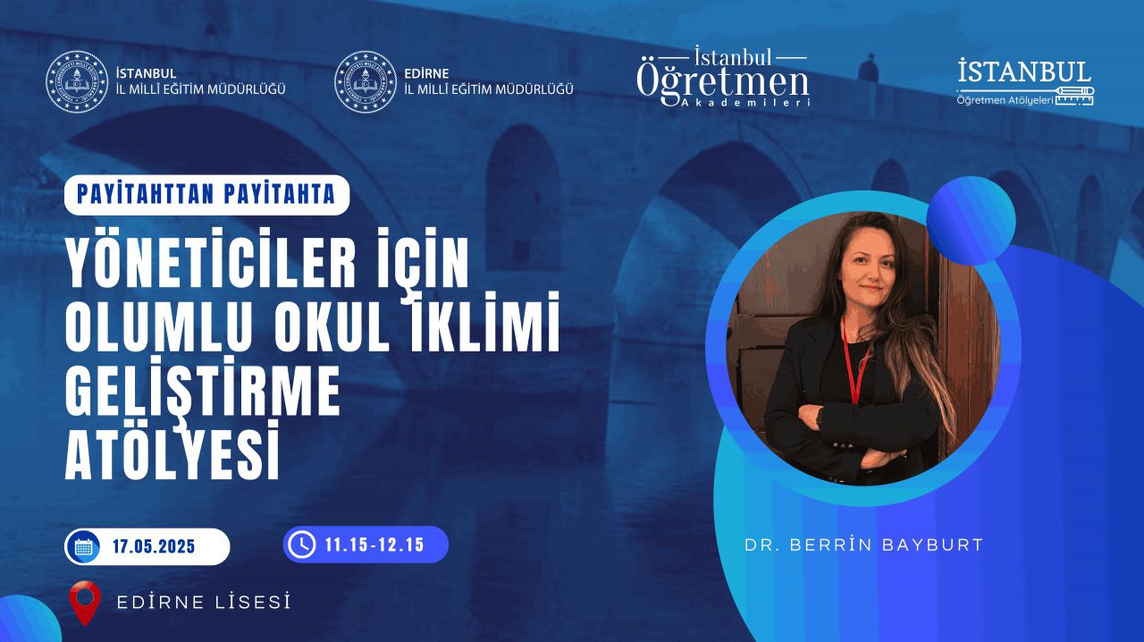 Edirne ilinde görev yapan okul/kurum yöneticilerine yönelik olarak gerçekleştirilecek atölyemizin kontenjanı 20 kişi ile sınırlıdır. Atölyemiz, Edirne Lisesi'nde gerçekleştirilecektir.