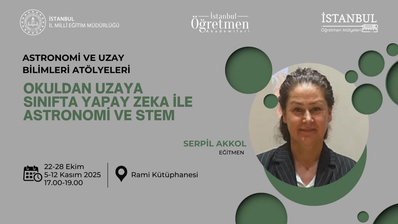Bu kapsamda ilk atölye çalışmamızın başlığı: '' Sınıfta Yapay Zeka İle Astronomi ve STEM '' Sınıf öğretmenleri başta olmak üzere tüm branş ve kademelerden öğretmenlerimiz için ufuk açıcı olacağına inandığımız atölyemizin ilk çalışması alanda uzman ve disiplinler arası çalışan Serpil AKKOL öğretmenimiz.