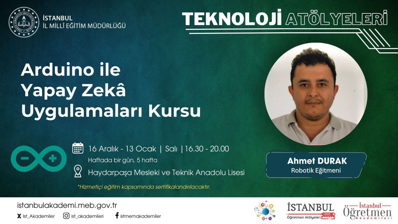 Bu faaliyet; Bakanlığımız okul/kurumlarında görev yapan öğretmenlerin “Arduino ile Yapay Zekâ” konusunda bilgi ve becerilerini artırmak amacıyla düzenlenmiştir. Bu faaliyeti başarı ile tamamlayan her kursiyer;