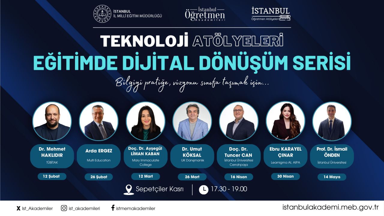 İstanbul İl Millî Eğitim Müdürlüğü Teknoloji Atölyeleri tarafından düzenlenen bu özel serinin II. Dönem eğitimlerinde, eğitimde dijital dönüşümün tüm yönleri ele alınıyor. Her biri alanında öncü konuşmacıların yer alacağı buluşmalarda, teknolojinin sınıf ortamına nasıl entegre edileceğinden yapay zekâdan finansal okuryazarlığa kadar pek çok yenilikçi öğretim yaklaşımları masaya yatırılacak.