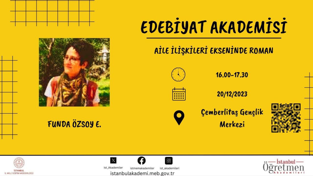 Çarşamba günleri 16.00-17.30 saatleri arasında Çemberlitaş Gençlik Merkezinde devam eden Edebiyat Akademisinin bu haftaki konuğu Funda Özsoy E.'den Aile İlişkileri Ekseninde Roman konusunu dinlemek için başvurabilirsiniz.