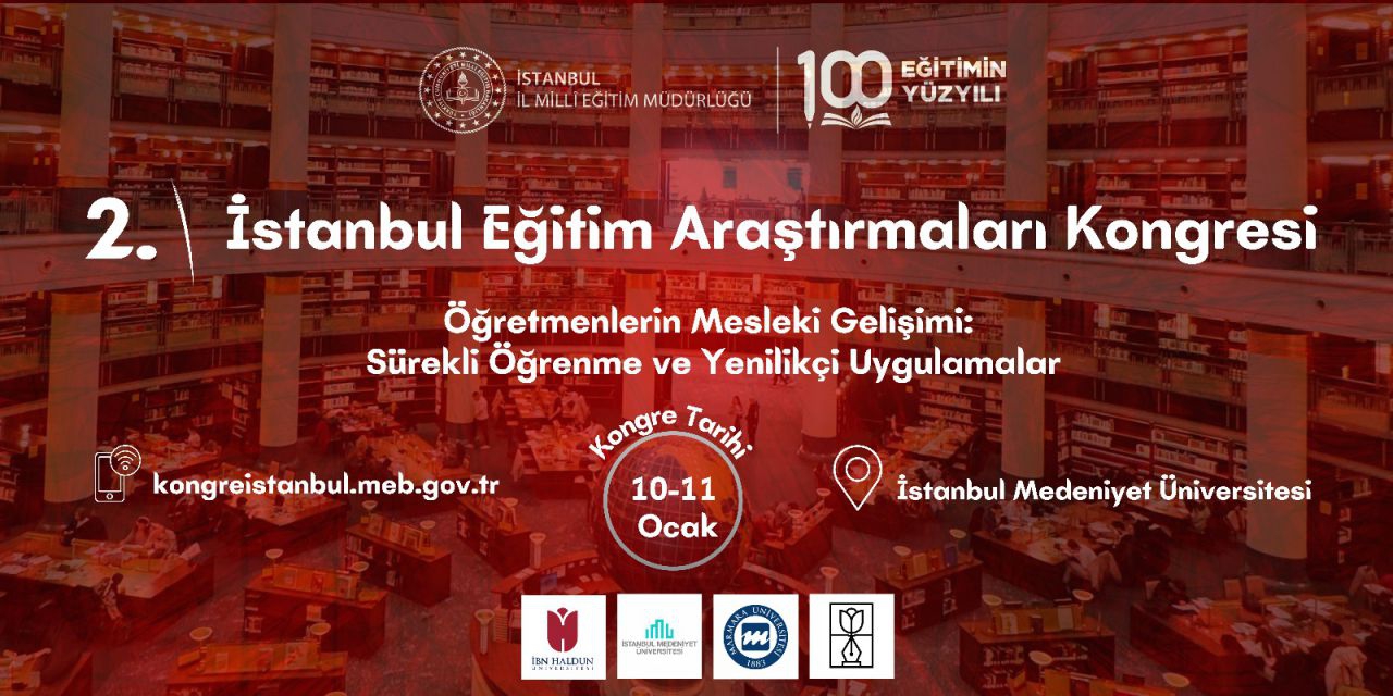 Türkiye Yüzyılı Maarif Modeli'nin sahada daha etkili uygulanabilmesi için öğretmenlerin sürekli mesleki gelişim süreçlerine katılımını ve yenilikçi uygulamaları merkeze alan 2. İstanbul Eğitim Araştırmaları Kongresi, 10–11 Ocak 2026 tarihlerinde gerçekleştirilecek.